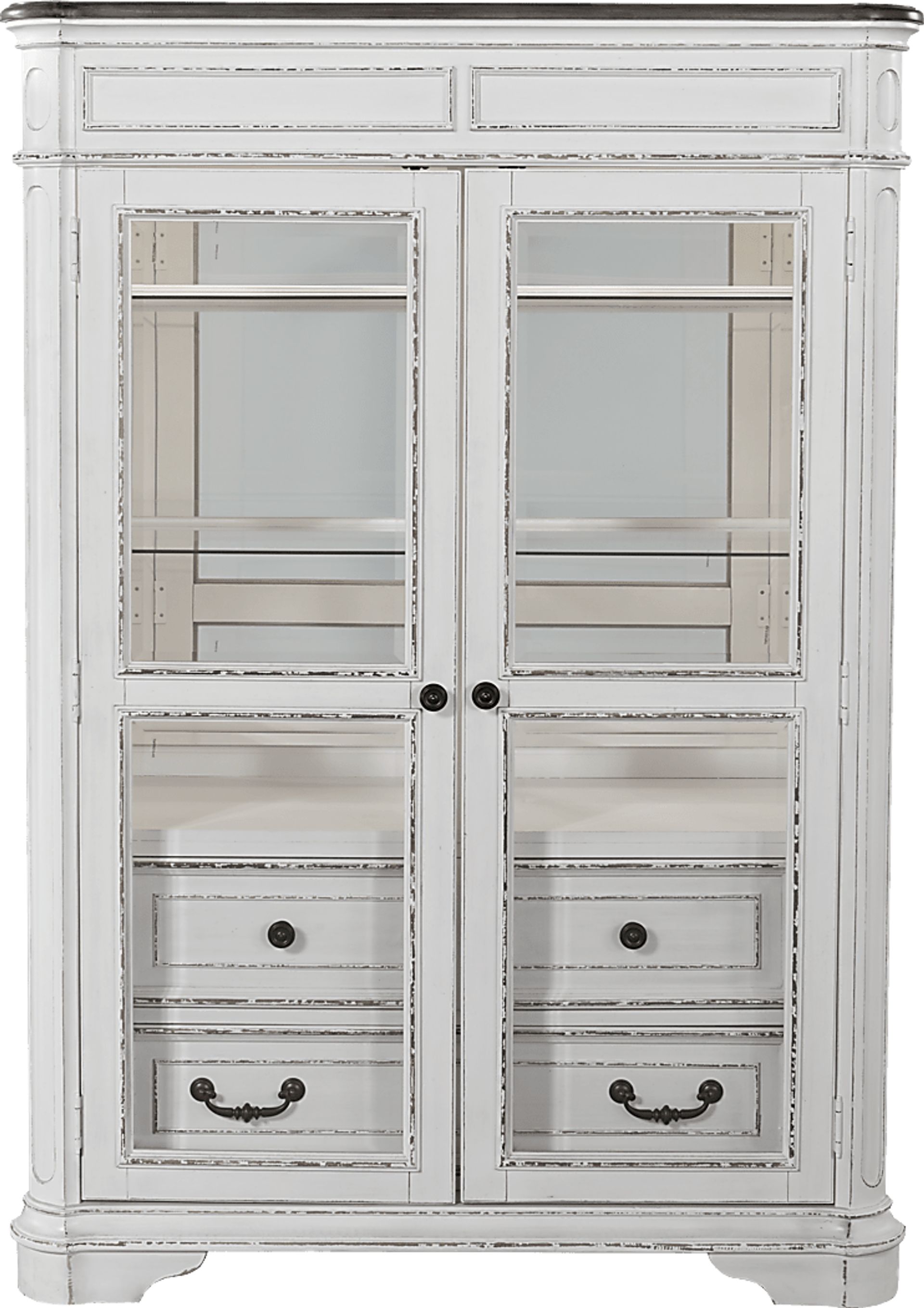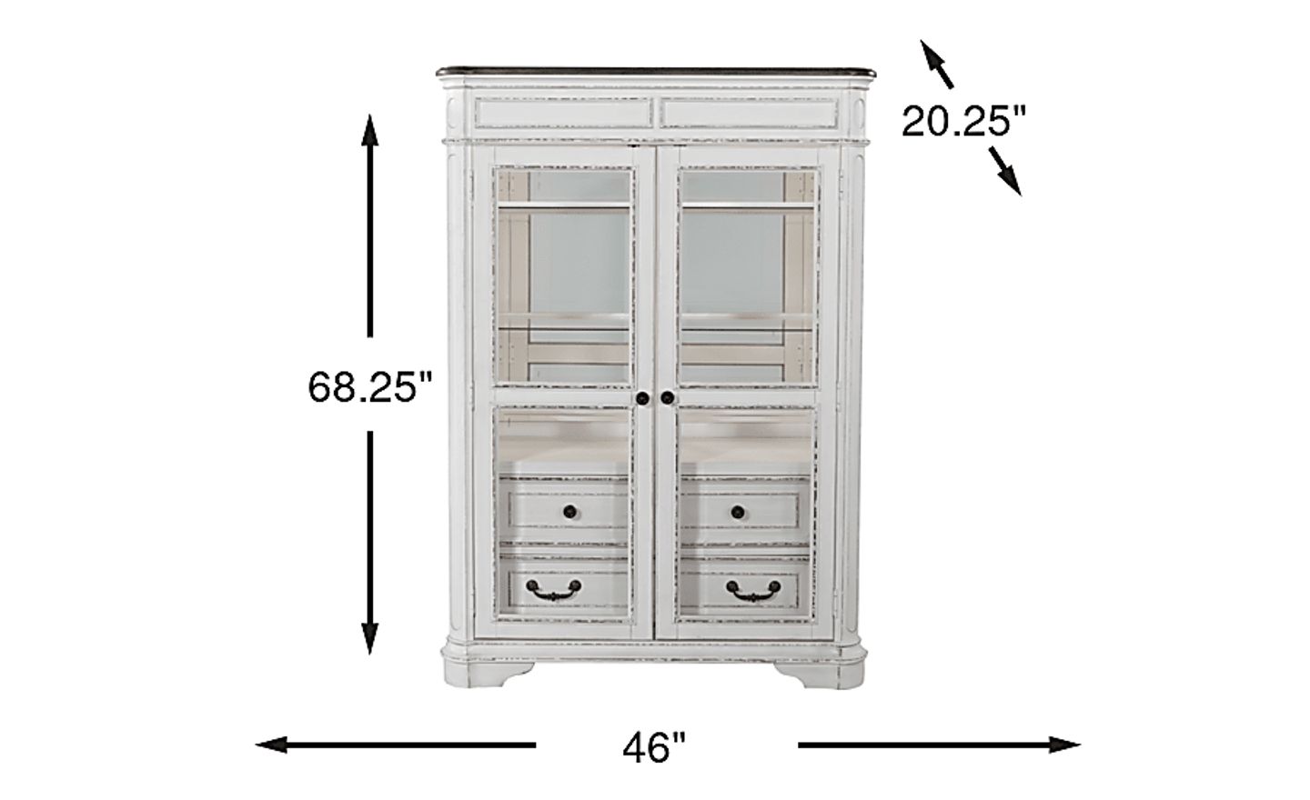 Classic, antique looks are paired with practical storage space for all of your display needs. The chipped white distressed finish creates an aged look that helps bring attention to this piece. Framed glass doors with a stylish bevel, allow for easy display while built in LED touch activated lighting ensures everything is easy to see. Four drawers with English front and French back dovetail joints and brass finish metal hardware provide plenty of additional storage. Adjustable glass shelves guarantee the configuration that works best for your needs.