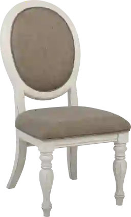 The rustic charm of the French Market oval back side chair is a masterful blend of traditional stylings and modern comfort. The chipped white distressed finish creates an antique feel to this chair while the upholstered gray padded seat provides great comfort.