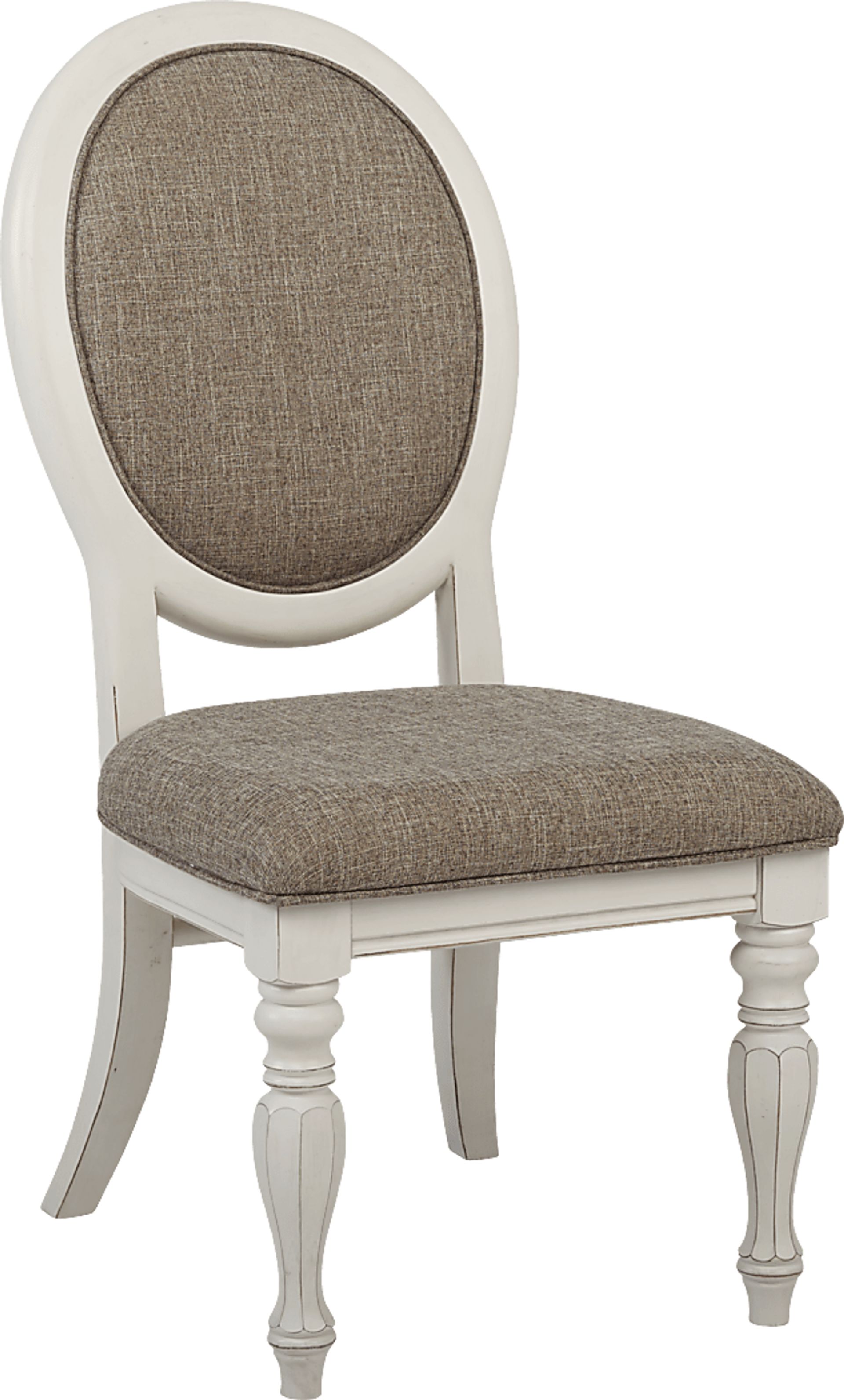 The rustic charm of the French Market oval back side chair is a masterful blend of traditional stylings and modern comfort. The chipped white distressed finish creates an antique feel to this chair while the upholstered gray padded seat provides great comfort.