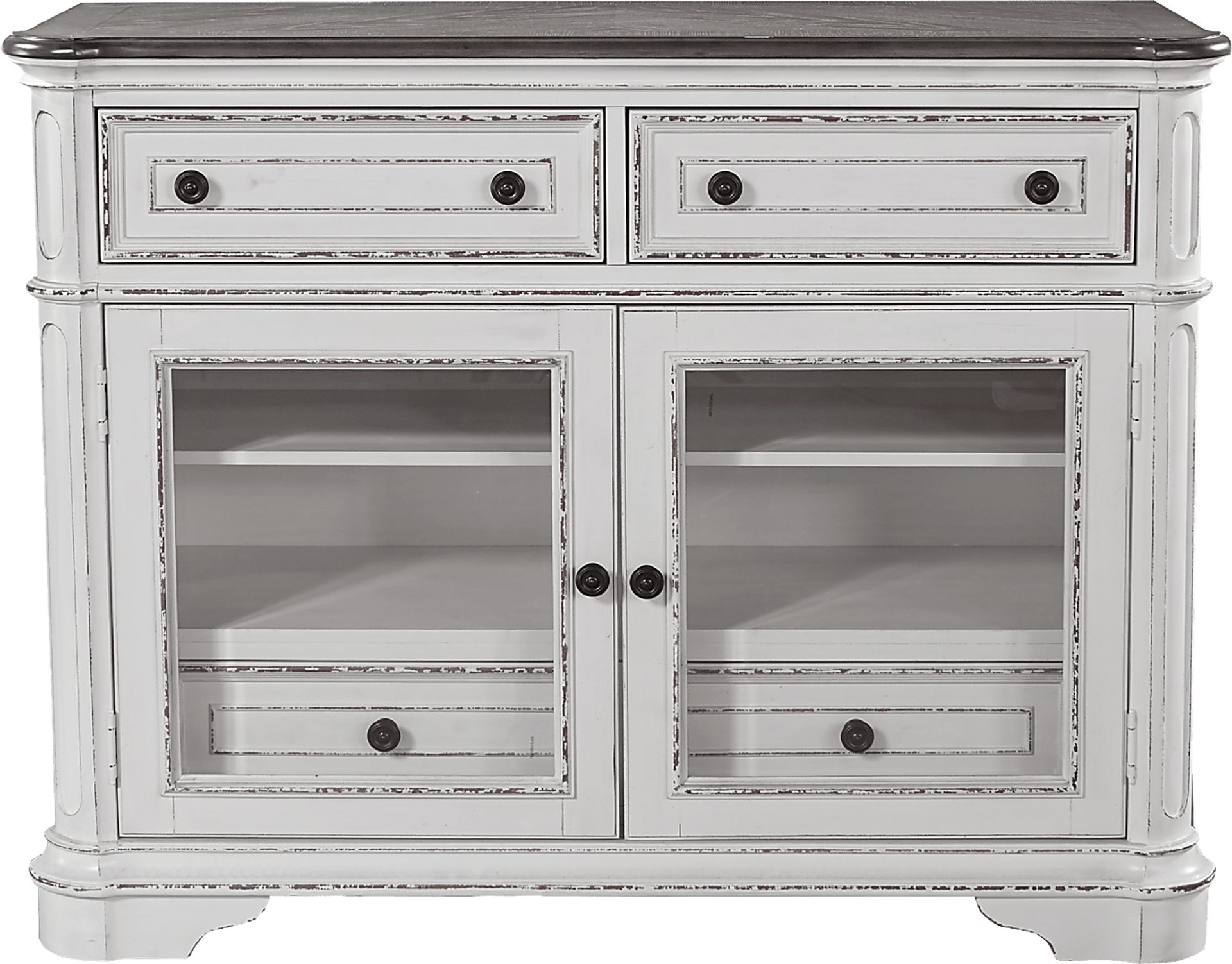 Classic, antique looks are paired with practical storage space for all of your display needs. The chipped white distressed finish creates an aged look that helps bring attention to this piece. Framed glass doors with a stylish bevel, allow for easy display. Four drawers with English front and French back dovetail joints and brass finish metal hardware provide plenty of additional storage.