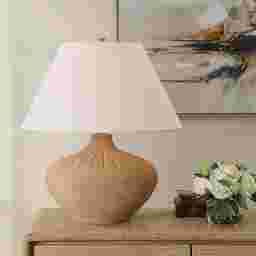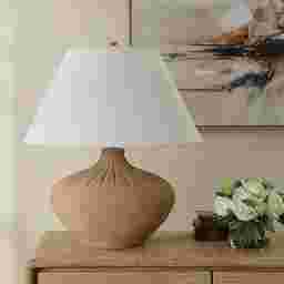 The Fresi Terracotta Lamp feels like a timeless piece shaped by sun-baked clay and artisan hands-its warm, sandy base gently textured like earth kissed by desert wind, rising into a beautifully sculpted neck with understated ridges that add depth and quiet elegance. The generous, soft-white shade balances the form with a calming glow, creating a look that feels both grounded and effortlessly sophisticated, like something found in a serene Mediterranean retreat. Let this warm, organic, soul-soothing lamp be the one you bring into your home. Partial assembly may be required.
