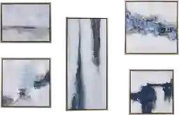 Elevate any space with the modern design of the Frozen Thoughts embellished canvas gallery 5 piece set. Each art piece features a different abstract design in contrasting blue hues and light neutral colors, for a strikingly modern and contemporary update. Gold foil accents, hand embellishments, and gel coat finishes are showcased on specific pieces within the set, combining different textures within the gallery set for added dimension and a luxe flair. A gold frame adorns each canvas to highlight the abstract artwork and create an elegant finish. Sawtooth fixtures are attached to the reverse of each piece making it easy to hang simply hang pieces closer together for a more bold focal point or add some space and breath in between for a large oversized gallery look