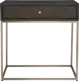 Showcasing understated style, the Fulen Dark Walnut Side Table is layered in a dark walnut finished oak veneer accented with a herringbone drawer front. Rests on a steel base in plated brushed brass with a coordinating drawer pull.