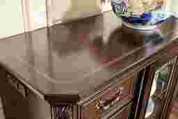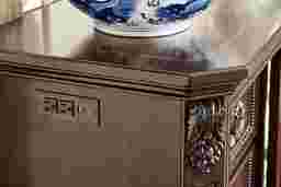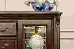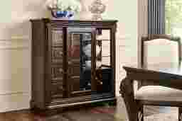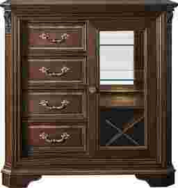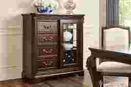 Graceful gatherings and timeless traditions come to life in the Fuller collection, where elegant details and rich tones elevate everyday dining into something extraordinary. Rooted in traditional style, this bar cabinet is crafted with cherry veneers in a brown cherry finish that beautifully highlights refined carved details and classic flourishes. Four side drawers provide convenient storage for bar essentials, while a framed glass door opens to reveal a central shelf and built-in wine rack for both function and display. Integrated LED lighting softly illuminates the interior, creating the perfect stage for showcasing your most treasured glassware and cocktail accessories. Decorative knobs and pulls with a silver finish complete the look with a refined, sophisticated touch.