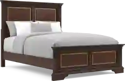 Indulgence awaits when the richness of the Fuller bed's dignified, rakish charm tempts you back to your serene sleep sanctuary. Cherry veneers in dark brown create an elegant mood, while light walnut inlays on the headboard and footboard add contrast. Punctuating the moulded trim on top are subtle carved pilasters for a perfect finishing touch. Mattress and foundation (if required) sold separately.