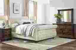 Indulgence awaits when the richness of the Fuller bedroom's dignified, rakish charm tempts you back to your serene sleep sanctuary. This inspired traditional collection showcases a fully upholstered Ivy bed with sleigh headboard and footboard in white, dotted throughout with button tufting. Dark bun feet add a touch of contrast to suit a variety of styles. The headboard features USB ports set into either side, bringing modern convenience to a timeless design. Included pieces create an elegant mood with cherry veneers in a dark brown finish, subtle carved pilasters, and contrasting inset details. The 7-drawer dresser has a mount for the matching beveled mirror. Mattress and foundation (if required) sold separately.