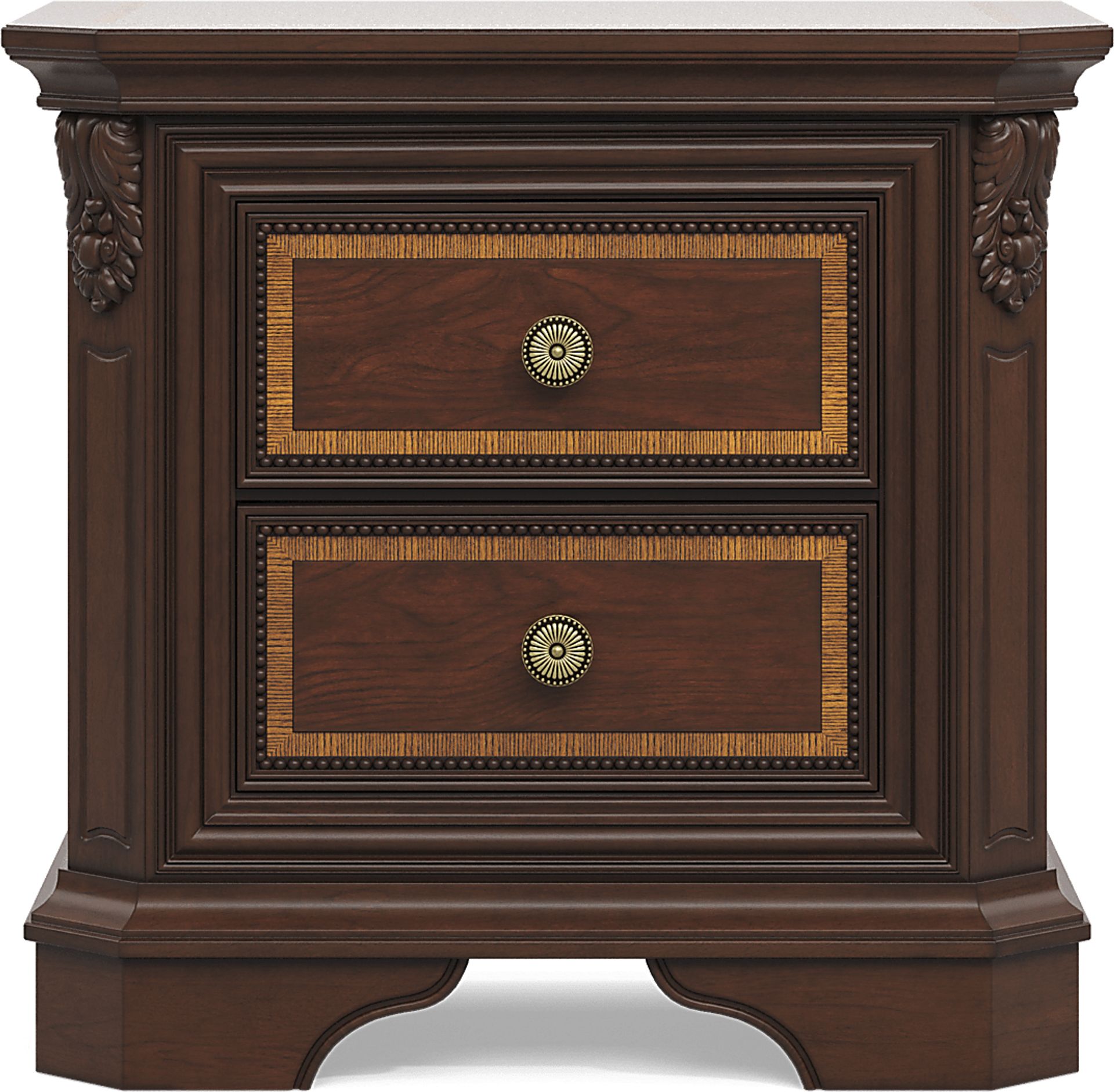 Indulgence awaits when the richness of the Fuller nightstand's dignified, rakish charm tempts you back to your serene sleep sanctuary. Cherry veneers in dark brown create an elegant mood, while light walnut inlays framing each drawer add contrast. USB and USB-C charging ports are hidden on the back to add luxurious convenience. Punctuating the moulded trim on top are subtle carved pilasters for a perfect finishing touch.