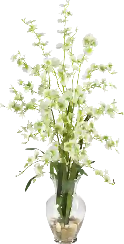 This arrangement is crafted to be a high-fidelity botanical replica. It features dozens of full, white silk blooms and detailed green leaves that capture the delicate texture of a natural orchid. To enhance the realism, the arrangement is set in a clear glass vase with river rocks and artificial water, creating the convincing appearance of a living plant in a permanent state of perfect bloom.