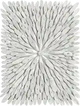 This Bahlow wood wall panel is handcrafted from individually cut natural driftwood pieces in a white washed finish, artfully arranged in a striking sunburst pattern. May be hung horizontal or vertical. Customer assembly is required.