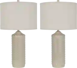 Update your contemporary styled home with the Bimini Sea lamp, set of 2. Features an antiqued cream finish with raised studded texture and topped with an oatmeal slub linen shade to bring an added dimension to the living room or bedroom. Partial assembly may be required.