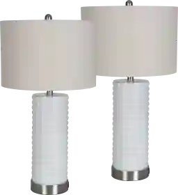 The Birscoe table lamp features a solid white glass base with dotted texture. The silver platted base contains a USB port. This multi-functional elegant lamp will complement any interior space from traditional to modern. Customer assembly is required.