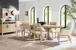 Boasting a rich blend art deco elements with minimalist flair, the Callen Way dining room offers chic, contemporary style for mealtime. Crafted of hardwood solids and knotty oak veneers, this set features a table with trestle legs underneath a thick, rectangular top. The 20-inch leaf extends table's length to 96-inches. The table's buttery beige color compliments the rounded corners and edges, while four coordinating side chairs with upholstered seats finish the look.