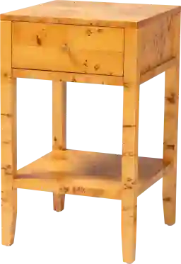 To highlight the crisp geometry and rich knots of the burl wood, keep the top surface curated with a sleek modern lamp and one or two personal items. The round metal drawer knob serves as a subtle accent that can be echoed with other metallic decor in the room. We suggest using the open lower shelf for a textured basket or a few art books to add dimension without making the space feel crowded.