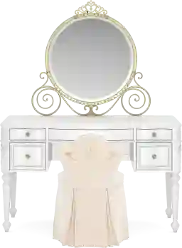 Create a fairytale escape for your little royal with the Disney Princess collection, where every night feels like a bedtime ball and every morning begins a brand-new adventure. With three drawers and a spacious work surface, the elegant desk in this set offers the perfect setting for everything from homework to coloring. The gently curved silhouette is finished in sparkle white and accented by custom gold rose drawer pulls with faux crystal insets. Featuring soft-close glides and French dovetail fronts with English dovetail backs, the drawers open smoothly and quietly. A pink felt-lined top drawer provides a soft space for special keepsakes and writing supplies, while a built-in power station with two AC outlets and dual USB ports brings modern convenience to this princess-worthy design. Paired with the LED-lit carriage mirror, this desk transforms into a magical vanity setup. Shaped like an enchanted carriage and trimmed in sparkle white, the mirror features a multicolored LED light strip that can be controlled with the included remote or the Lotus Lantern app. A matching peachy pink slipcovered vanity chair completes the space with comfort, charm, and storybook style.