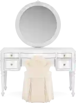 Create a fairytale escape for your little royal with the Disney Princess collection, where every night feels like a bedtime ball and every morning begins a brand-new adventure. With three drawers and a spacious work surface, the elegant desk in this set offers the perfect setting for everything from homework to coloring. The gently curved silhouette is finished in sparkle white and accented by custom gold rose drawer pulls with faux crystal insets. Featuring soft-close glides and French dovetail fronts with English dovetail backs, the drawers open smoothly and quietly. A pink felt-lined top drawer provides a soft space for special keepsakes and writing supplies, while a built-in power station with two AC outlets and dual USB ports brings modern convenience to this princess-worthy design. Paired with the round mirror, this desk transforms into an iconic vanity setup. A matching peachy pink slipcovered vanity chair completes the space with comfort, charm, and storybook style.