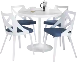 This set features a versatile blend of contemporary clean lines and modern farmhouse warmth. The crisp white pedestal base and the unique backrest design of the chairs allow it to serve as a stylish centerpiece that pairs equally well with rustic wood accents, coastal palettes, or minimalist modern interiors.