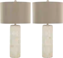 Add eye-catching style to your space with the gorgeous Iris Nest Off-White Lamp, Set of 2. The cylindrical polyresin base features an intricately carved pattern, a matching finial, and a linen drum shade. Partial assembly may be required.