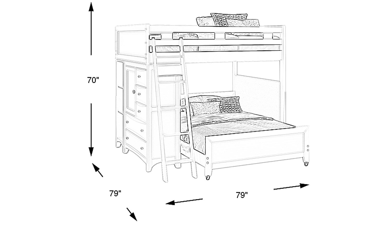 This furniture is an ideal "room-in-a-box" solution for space-constrained environments. By stacking two full-sized beds and integrating a five-drawer chest and a bookcase into the frame, it condenses an entire bedroom's worth of furniture into a single 79" x 79" footprint. This vertical approach is a hallmark of smart urban design, providing ample storage and sleep capacity without overcrowding the floor plan.