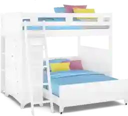 The Ivy League full over full loft makes the most of the space in your child's bedroom. On one side you'll find a storage chest with five beveled drawers and brushed steel hardware and adjustable shelves fronted by a door and a built-in bookcase. The full bottom bed is on casters so it can be moved easily. Durable construction is complemented by a beautiful white finish. Mattress and foundation (if required) sold separately. Bunkie board required. Bed shown is twin/full.