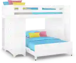 Smart, space saving design gives the Ivy League twin over twin step loft great appeal. You'll love the combined value of having a built-in chest with beveled drawers and brushed steel hardware, steps with storage drawers, a built-in bookcase adds to the storage. For safety, each step has skid resistant textured strips. Quality constructed with veneers in a white finish, this is a timeless choice. The twin bed at the bottom is on casters so it can be moved easily. Mattresses and foundations (if required) sold separately. Bunkie boards required.