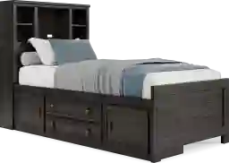 With a timeless look and classic construction, the Creekside 2.0 bookcase bed is a wonderful choice for saving space in your child's room. Crafted with pine veneers in a charcoal finish, this twin-size bed features a bookcase headboard with shelves that have integrated wire management to help keep your child's favorite things within arm's reach. Additionally, a storage side rail with two doors and a pair of drawers provides bedside space to store comics, books and more. Mattress and foundation (if required) sold separately.