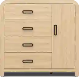 Uncover clever hideaways, tidy nooks and everyday essentials made magical in the Hidden Hills collection by Drew & Jonathan. The chest features real oak wood veneers with a natural grain highlighted by a gentle, light finish that adds calm warmth to the look. Each of the four drawers is constructed with English dovetail joinery at the front and back, reinforced corner blocks and side-mounted glides for smooth, easy opening. A dust-proof panel protects the bottom drawer while keeping clothing neatly stored. To the right, a soft-curved door opens to reveal adjustable interior shelves, providing an ideal spot for organizing folded clothes, favorite books or everyday essentials you'd rather keep out of sight. Shaped with contemporary flair, the hardware is finished in oil-rubbed bronze for a final flourish that nails the piece's balance of simplicity and style.