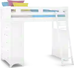 The Ivy League 2.0 twin loft makes the most of the space in your child's bedroom. On one side you'll find a storage chest with five beveled drawers and brushed steel hardware and adjustable shelves fronted by a door. Durable construction is complemented by a beautiful white finish. Mattress and foundation (if required) sold separately. Bunkie board required.