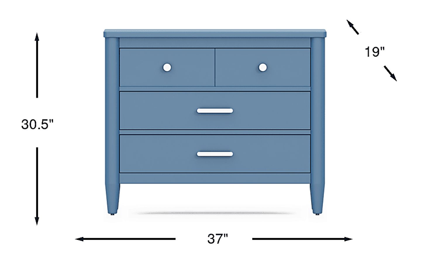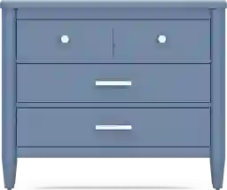 The ultimate style for your color obsession is finally here with the Modern Colors loft chest. Showcasing slate blue finish, this piece balances ultra-sleek craftsmanship with an easygoing look. Each of the three drawers are sanded smooth to help store clothing, extra bedlinens and more. The drawers are crafted with front French dovetail joints and have ball bearing, side mounted glides. A pair of knobs on the top drawer and pulls on the remaining 2 drawers are finished in brushed nickel. Brushed gold hardware is also included with purchase. Tapered spun legs supply the chest with a chic final touch.