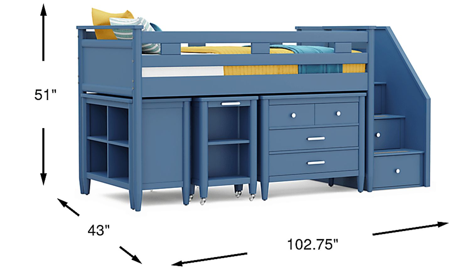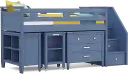 The ultimate collection for your color obsession is finally here with the Modern Colors twin low loft bed. Showcasing slate blue finish, each piece balances ultra-sleek craftsmanship with easygoing comfort. Featuring a twin bed that sits lower to the ground than a traditional loft, this piece has a reversible staircase that can be affixed to either side of the bed. The steps feature storage drawers that are perfect for stashing away clothing, books and more. The coordinating loft chest has three drawers crafted with front French dovetail joints and ball bearing, side mounted glides. Soar through study time with the coordinating caster desk that can be wheeled out and around at a moment's notice. The desk even has a couple cubbies that are perfect for textbooks or homework supplies. A matching 37-inch bookcase can shelve books, comics, magazines, decor and more. The hardware is finished in brushed nickel but brushed gold knobs and pulls are also included with purchase. Mattress and foundation (if required) sold separately. This product requires a bunkie board (sold separately).