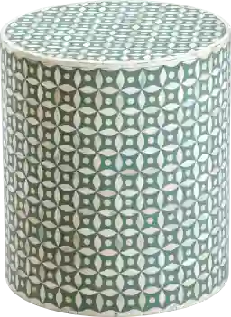 The Pyburn green accent table is a round scatter table with a diamond patterning alternating natural bone and seafoam resin.