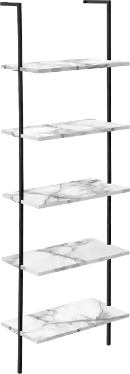 This charming and minimalist Winbrow ladder bookcase is a great way to bring a modern luxury style to your decor. It is crafted with an open black metal frame for a glam look, and mounts to the wall to keep it in place. Five tier ample shelving made from engineered wood in a white marble-look finish and provide the perfect place for books, plants, bar essentials, or anything else you want to display. Mount this tall and narrow space-saving bookshelf to the wall in your home office, living room, or bedroom. Customer assembly is required.