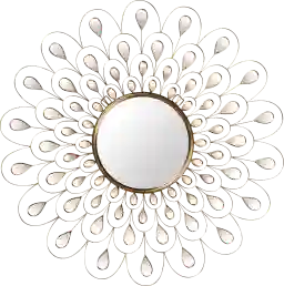 The Zelva stunning wall mirror is constructed with a round glass mirror surrounded by many smaller acrylic mirrors to appear like a sunflower. Wrapped around the mirrors is a metal frame with handmade gold foil that intensifies the design of the sunflower and increases the elegance of the mirror. This wall mirror is ideal for adding more utility to a wall and enhancing the space of a room, making it feel larger and lighter. Two hangers are attached to the back of the mirror for quick and easy installation. Packaged in strong carton with full protective corners and styrofoam.