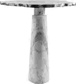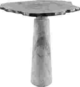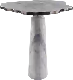 Sculptural elegance and freeform metal top & natural marble end table elevate your living space with the Galatian end table, where timeless materials meet modern design. The table features a freeform textured metal top, its organic shape adding a touch of artistic flair and a sophisticated edge to your decor. The intricate metal texture contrasts beautifully with the solid natural white marbleized stone base, which features subtle greyish undertones that add depth and elegance. The cylindrical marble base provides excellent stability, grounding the table with its substantial weight and timeless beauty. This design balances both style and strength, making it perfect for any living room, entryway, or bedroom where you want to add a refined, sculptural element. Customer assembly is required.