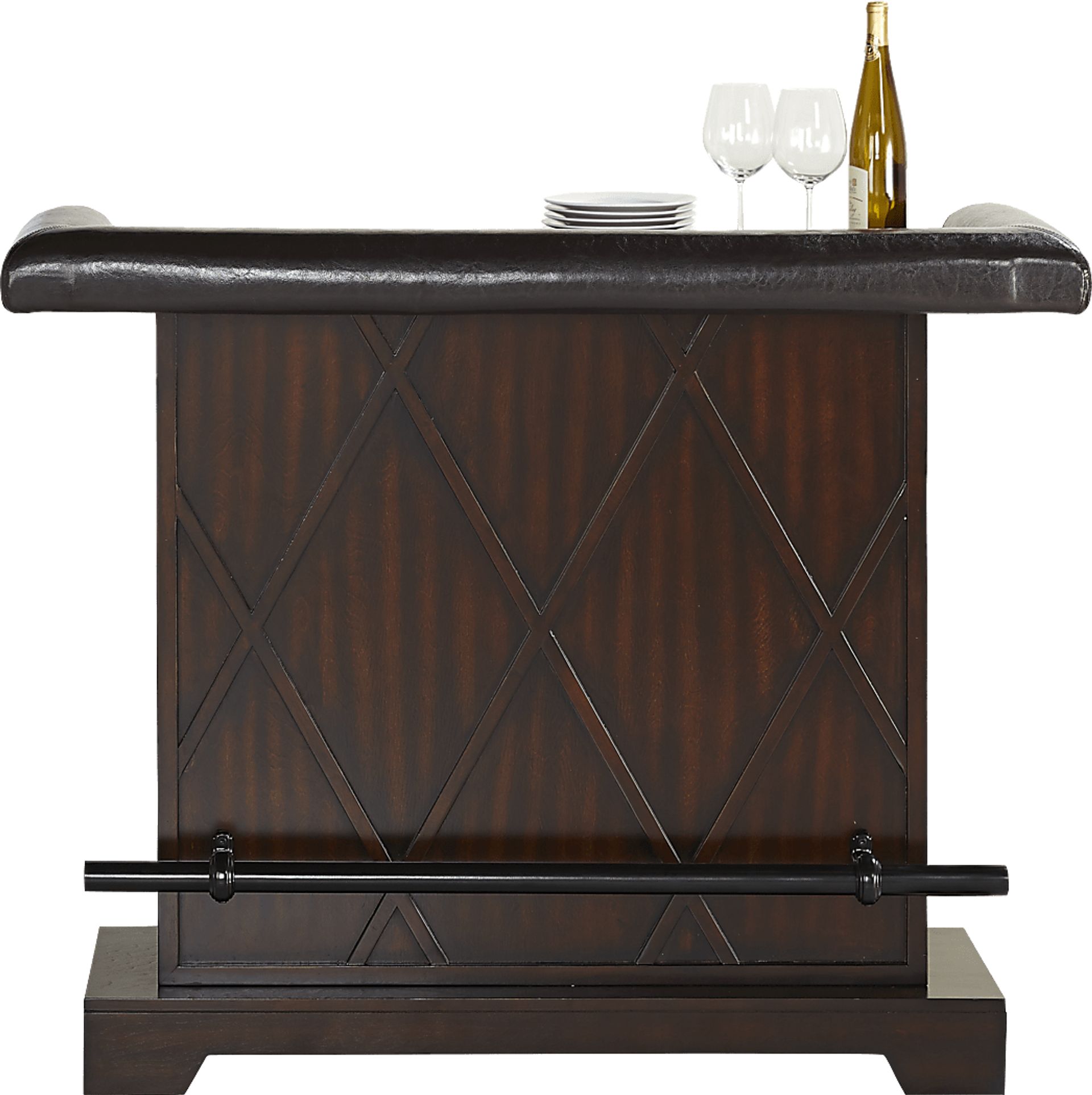 Make entertaining easy with the Galeno bar. This handsome piece is crafted with birch veneers in a rich cherry tobacco finish. The top features wood grain laminate surrounded by black padded Ultrahyde. Amenities include a black metal foot rail on the front along with stemware holders and a long storage shelf on the back.