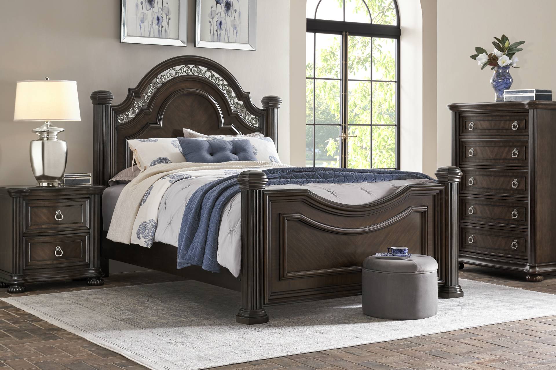 With refined poise and a glint of sprightly charm, the Gallagher Avenue bedroom offers a noble start to every single day. The handsome textures of this traditional set are rendered in acacia veneers with a rich brown finish. Reeded bedposts, a framed footboard and the headboard with contrasting silver scroll details showcase a variety of European influences in this design. The matching chest and nightstand has metal ring pulls on each of their curved drawers for ease of use, making this room perfect for apartments, condos and other small spaces. Mattress and foundation (if required) sold separately.