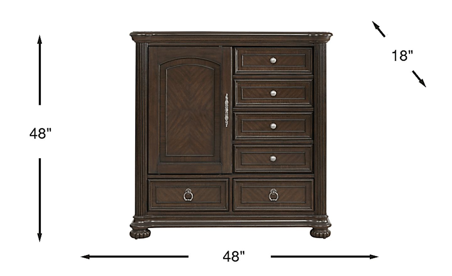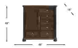 With refined poise and a glint of sprightly charm, the Gallagher Avenue door chest offers a noble start to every single day. The handsome textures of this traditional piece are rendered in acacia veneers with a rich brown finish. Details like reeded corner posts, decorated bun feet, and styled metal pulls showcase an exquisite aristocratic design. The four top drawers are adorned with silver knob pulls while the two bottom drawers showcase silver ring pulls. English dovetail joints in the back and French dovetail joints in the front with side-mount, full-extension ball bearing glides makes each drawer function with ease and durability. For a perfect final touch, a sliding door adorned with a beautifully intricate pull handle opens to reveal two spacious shelves.