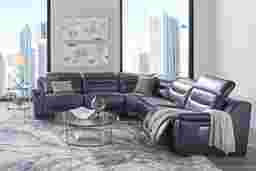 Sit in the lap of luxury with the sumptuous comfort and good looks of the contemporary Gallia Way sectional. Seating up to five adults, this chic sectional is upholstered in premium navy top grain leather wherever the body touches. Dual power adjustable headrests and footrests allow you to relax with the touch of a button, while plush tufted back cushions and padover chaise style footrests feel like a dream come true. Built-in USB ports on the end recliners keep your electronics conveniently charged. Chic, smart and comfortable: what more could you ask for? Top Grain Leather where the body touches with vinyl sides and backs.