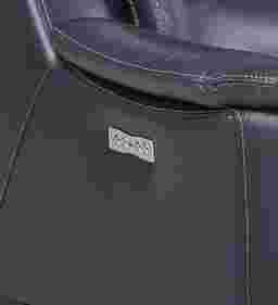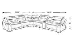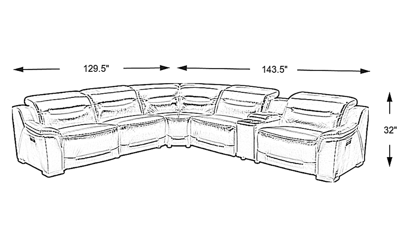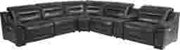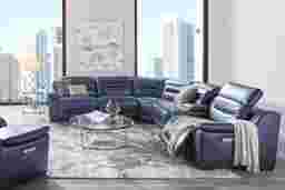 Sit in the lap of luxury with the sumptuous comfort and good looks of the contemporary Gallia Way sectional. Seating up to five adults, this chic sectional is upholstered in premium navy top grain leather wherever the body touches. Dual power adjustable headrests and footrests allow you to relax with the touch of a button, while plush tufted back cushions and padover chaise style footrests feel like a dream come true. Convenient cup holders and storage in the console, plus built-in charging USB ports on the end recliners cater to your every need. Chic, smart and comfortable: what more could you ask for? Upholstery: Top Grain Leather where the body touches with Vinyl sides and backs.
