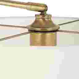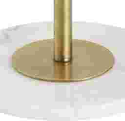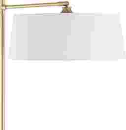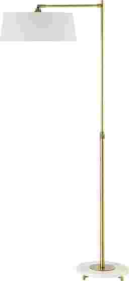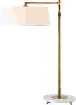 The refined Galster Road Brass Floor Lamp is crafted from iron finished in a plated antique brushed brass, attached to a white marble foot. This lamp features a telescoping neck that allows it to go from a 48 inches tall reading lamp to a 67 inches tall floor lamp. The shallow slightly tapered hardback shade is a white linen fabric, attached to a pivoting stem. Partial assembly may be required.