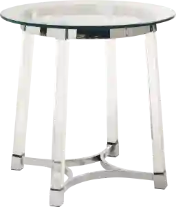The Gararai Clear End Table is just what your living room is missing This super stylish piece will easily pair with any decor or existing furnishings. The accent table features a round glass table top that is supported by a metal base. The legs on this table are acrylic, making it easy for this piece to become a staple in your home year after year. The base of the table is also metal and features a chrome finish. Sleek in design, this end table needs to be in your home right away Customer assembly required.