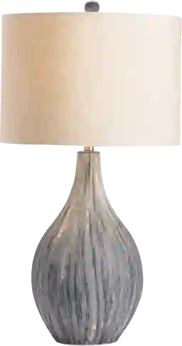 The Garcia Edge lamp features a matte glazed ceramic with a nautical navy scratch finish and offers a natural linen drum shade. Use this stylish lamp in your home or office as with its transitional style it will adapt to almost any decor. Partial assembly may be required.