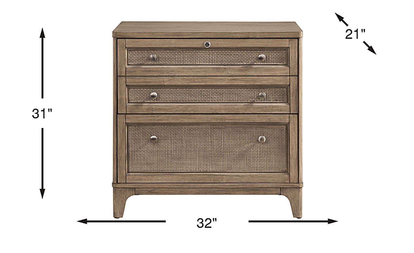 Timeless form with organic textures, warm tones and woven details in the Garden Grove collection brings the enduring charm of a warm cup of tea and heartwarming memories. Transitional in style, this lateral file is finished in warm brown and features three panel drawers accented with brown wicker inlays ideal for storing away everyday essentials. Silver knobs add a subtle, stylish touch that completes the look with understated elegance.