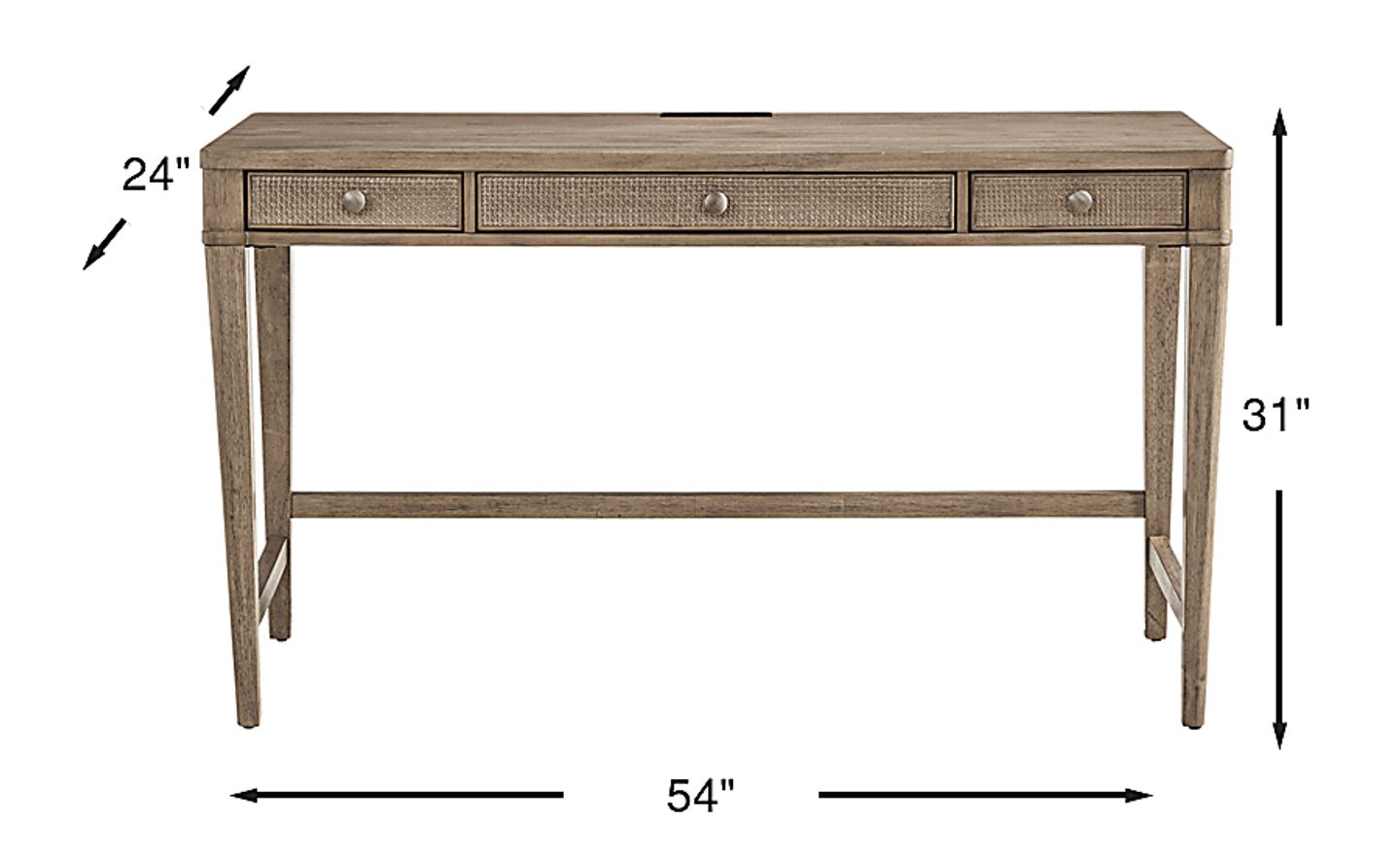 This desk features three integrated panel drawers, ideal for stowing away documents, tech accessories, and daily office supplies. The drawers are uniquely accented with woven wicker inlays and silver-finished knobs, combining a tactile, organic aesthetic with practical organizational space to help keep your primary workspace clutter-free.