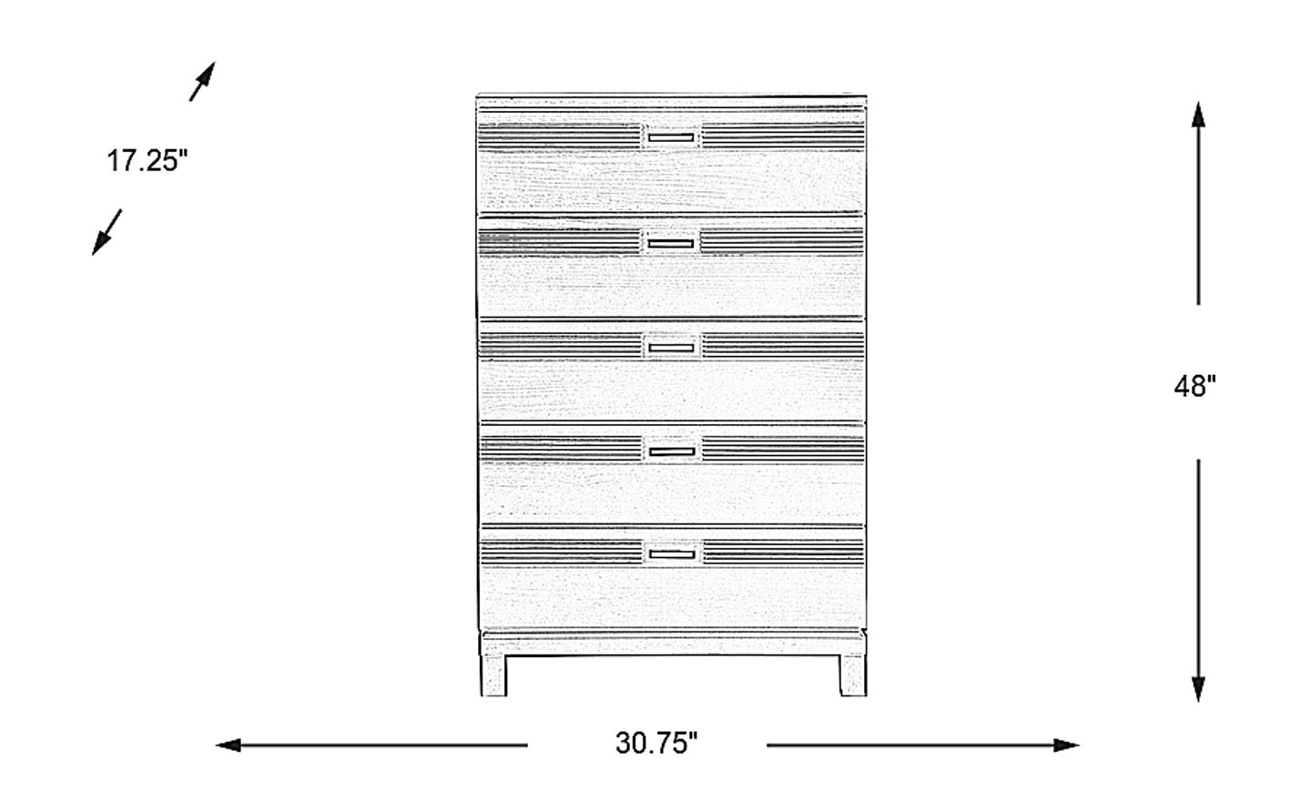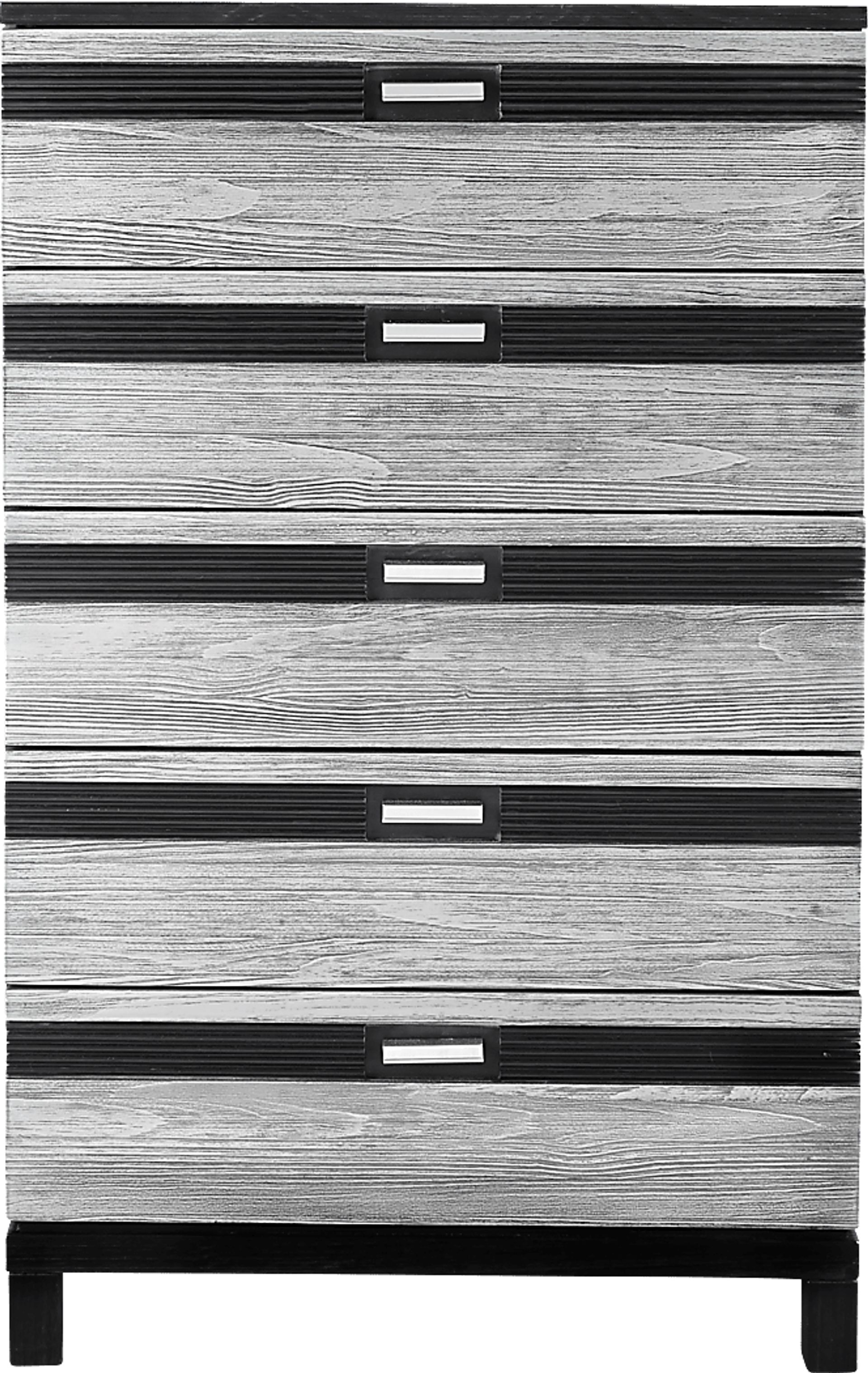 The beauty of the Gardenia chest lies in its details. Though it boasts a clean, modern design, this spacious chest is also bursting with thoughtful design elements such as the lead-free aluminum hardware or the French dovetail construction that strengthens each of the five drawers. This piece is crafted of pine solids with a water-based two tone brushed black and silver finish.
