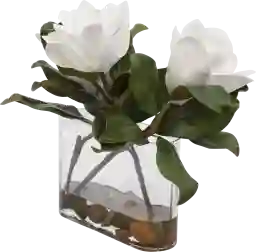 The Garrity is make up of a trio of white magnolia blooms are placed in a clear glass vase with faux water and natural river stones.
