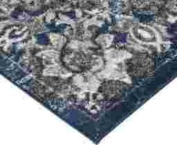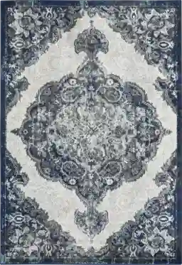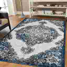 This rug's "updated Oriental" design bridges the gap between traditional elegance and modern farmhouse charm. The palette of navy, blue, gray, and white provides a sophisticated foundation that pairs beautifully with reclaimed wood furniture and neutral-toned seating. To create a cohesive look, coordinate your space with blue or gray accent pillows and warm metallic lighting, which provides a striking contrast to the cool tones of the rug.