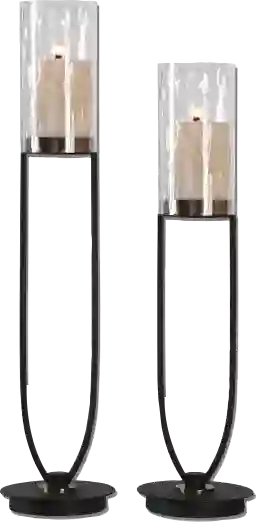 Matte black, open design iron work with coffee bronze details, and clear water glass globes, make up the set of 2 Gaylark candleholders. Sizes Short- 7.25x27, Tall- 7.25x30.5.