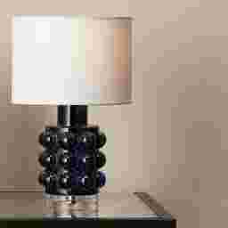 The intentional bubbles within the inky blue glass are crafted to create a "softly glowing" effect in the evening. When the lamp is on, these sculptural elements catch the light to produce quiet, shimmering sparks. This makes the lamp feel like a curated piece of art, instantly elevating the room with a sense of modern glamour and intentional design.