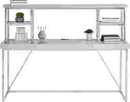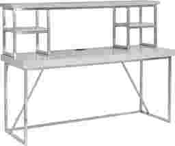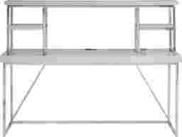 Consider the art of home office elegance mastered with the Geller collection. Crafted with birch veneers and a composite of wood solids in a gray color, the top of the credenza comes equipped with two power outlets and two USB-A charging ports. You'll love how nicely books, paperwork, décor and other small items fit on the coordinating hutch's tiered shelves. Brushed chrome finish on the ornate metal bases gives this set-up an ultra-modern final polish.