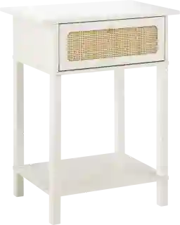 Bring some casual elegance to your space with the Gembat white nightstand. This practical and durably designed nightstand features a white laminate finish and a convenient closed cubby with a drop down front, accented with a simple wooden knob and fashionable natural rattan panel for all your essentials. The 2-tier design with a shelf offers ample space for decor and storage, making it perfect for use as an end table, side table or nightstand in your bedroom or living room. Versatile, with a space saving design and an easy to clean top, this nightstand is also easy to assemble with full illustrated instructions and floor protectors included. Customer assembly is required.